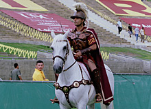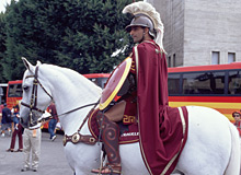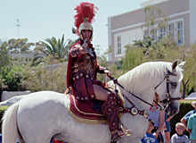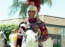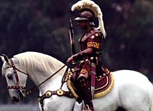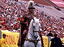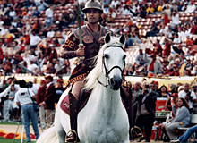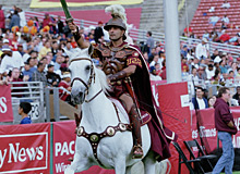 Saukko first appeared on Traveler in the outfit that actor Charlton Heston wore in "Ben Hur." That proved to be too cumbersome, so Saukko crafted his own leather costume in 1962, modeled after the Tommy Trojan statue on the USC campus (that outfit is still being used). But he still sometimes wore Heston's helmet. Interestingly, Saukko was once employed by Jim Crowley, one of Notre Dame's "Four Horsemen."